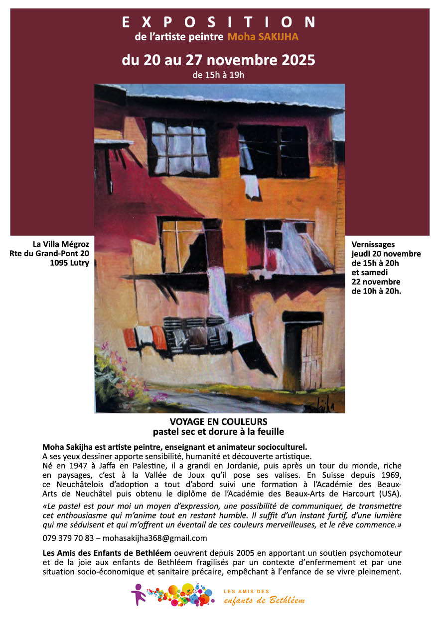 Cette exposition est entièrement en faveur de l'association "Les Amis des Enfants de Bethléem". Cette association, dont le siège est à Lutry, oeuvre depuis 2005 en apportant un soutien psychomoteur et de la joie aux enfants de Bethléem fragilisés par un contexte d'enferment et par une situation socio-économique et sanitaire précaire, empêchant à l'enfance de se vivre pleinement.