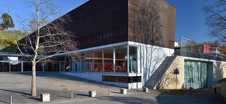 L'implantation épouse au mieux la topographie. Le corps des salles de classes, placé perpendiculairement à la pente, bénéficie d'une orientation sud-est idéale, ouvrant une vue magnifique sur la campagne, le lac et les montagnes. La parcelle sur laquelle se trouve le complexe s’étend sur plus de 36'000 m<sup>2</sup>.