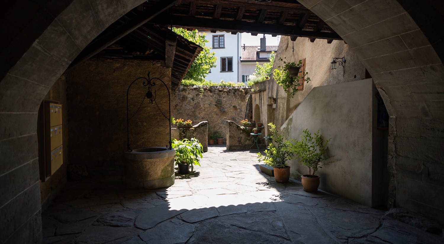Derrière la large porte cochère se trouve un vestibule couvert d'une voûte imposante, flanqué de deux arcades cintrées avec chapiteaux et muni de deux puits qui constituent le tout premier système connu d'alimentation en eau de Lutry.